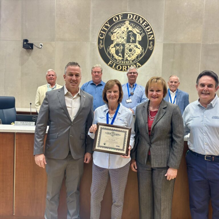 As a part of the FCCMA Professional Management Matters initiative, the City of Dunedin’s Mayor, Vice Mayor, City Commissioners, City Manager, and Deputy City Manager were recognized for 100 years of the Commission-Manager form of government by Pinellas County Assistant County Administrator Matt Spoor. Pictured front row left to right: Pinellas County Assistant County Administrator…