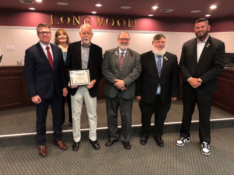 As a part of the FCCMA Professional Management Matters initiative, the City of Longwood’s District Mayors, City Council, and City Manager were recognized for 40 years of the Council-Manager form of government by Senior Advisor George Forbes. Pictured left to right: City Manager William Watts, District 1 Deputy Mayor, Abby Shoemaker, District 5 Mayor, Brian…
