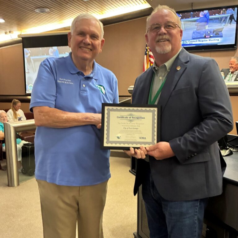 As part of the FCCMA Professional Management Matters initiative, the City of New Smyrna Beach Mayor, Current Commissioners, and City Manager were recognized by FCCMA’s Senior Advisor Ken Parker, for 105 years of the Commission-Manager form of government. Left to Right: City Manager Kevin Cowper and FCCMA Senior Advisor Ken Parker.